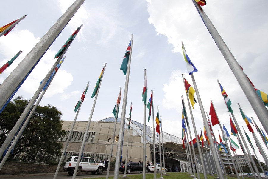 The file photo, taken on July 13, 2015, shows flags at the United Nations Economic Commission For Africa (UNECA) conference center in Addis Ababa, the capital of Ethiopia. (Xinhua/Michael Tewelde)