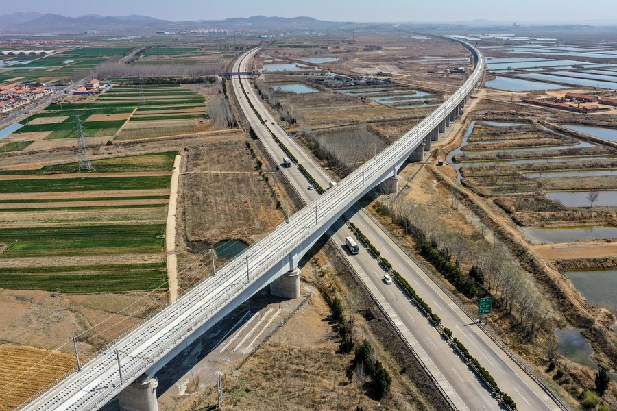 This aerial photo taken on March 31, 2023 shows a grand bridge of the Laixi-Rongcheng high-speed railway in Laixi, east China's Shandong Province. (Xinhua/Zhu Zheng)