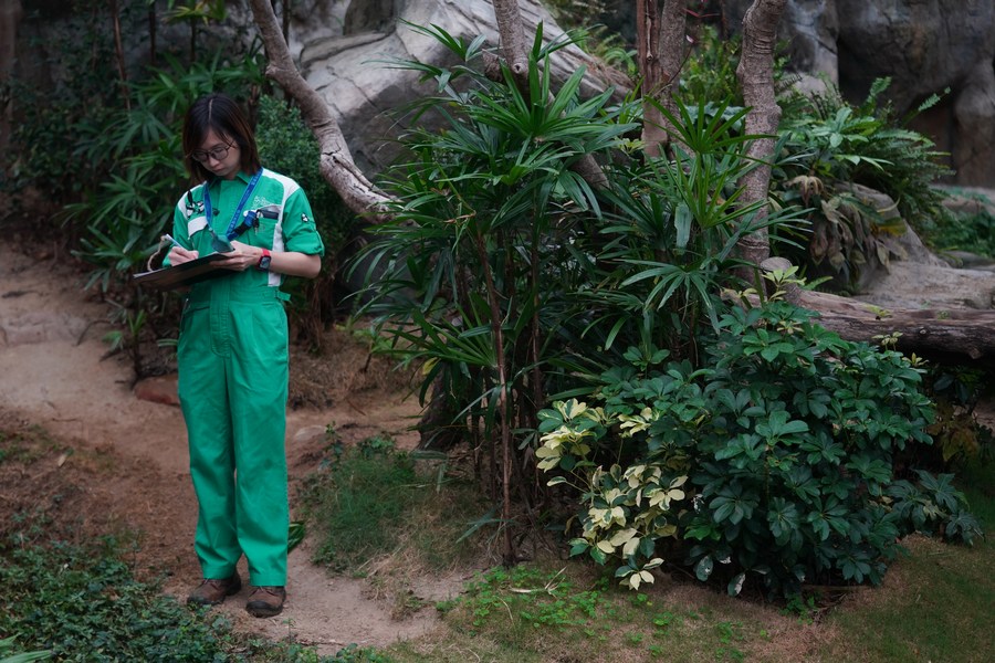 Caretaker Wu Jikei prepares for the opening of Ocean Park Hong Kong, south China's Hong Kong, April 19, 2023. (Xinhua/Wang Shen)