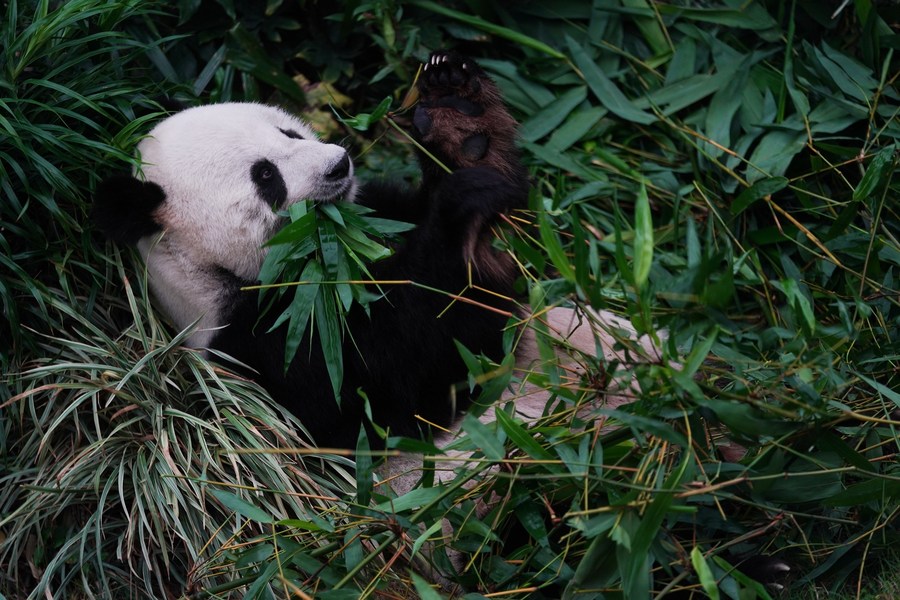 Giant panda Lele eats bamboo at Ocean Park Hong Kong, south China's Hong Kong, April 19, 2023. (Xinhua/Wang Shen)