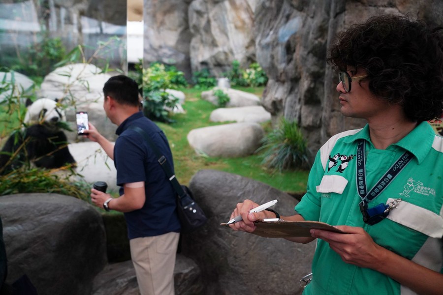 Caretaker Leung Galeun observes the health condition of giant panda Yingying at Ocean Park Hong Kong, south China's Hong Kong, April 19, 2023. (Xinhua/Wang Shen)