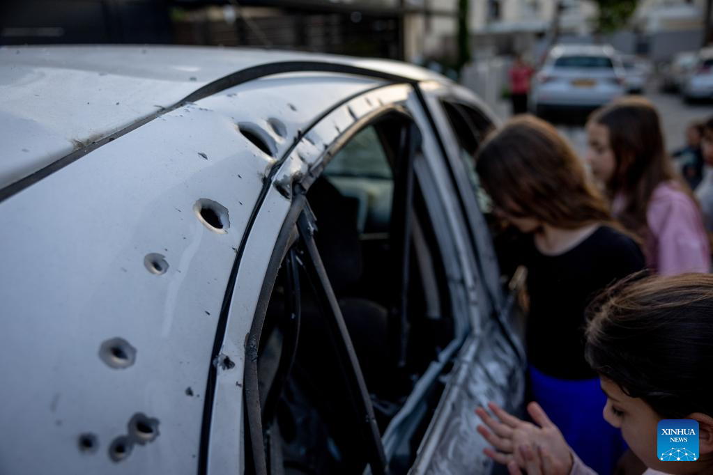 People check a car after it was attacked by a rocket in southern Israeli town of Sderot, May 2, 2023. Israeli media reported that at least nine people, including a Chinese worker, were injured after one of the rockets targeted a building in the southern Israeli town of Sderot. One of the injuries was in critical condition. (JINI via Xinhua)