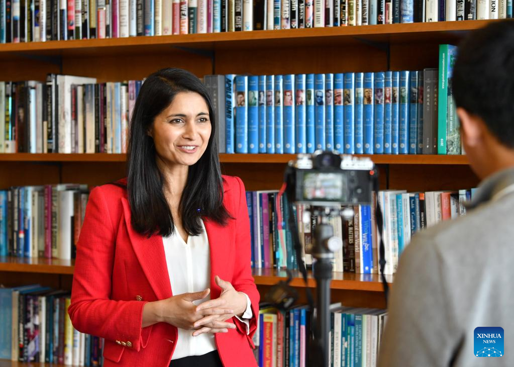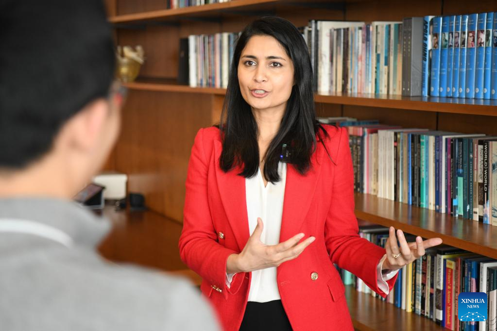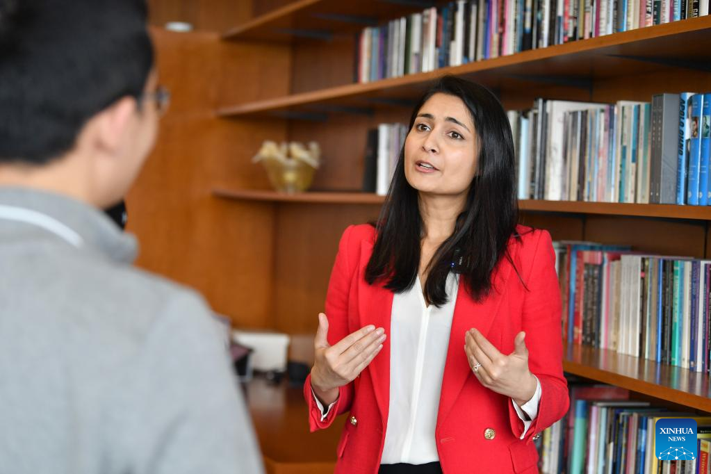 Saadia Zahidi, managing director of the World Economic Forum (WEF), speaks during an interview at the WEF headquarters in Geneva, Switzerland, on May 1, 2023. The global job market is set to change significantly over the next four years, according to a report published by the World Economic Forum (WEF) on Monday. (Xinhua/Lian Yi)