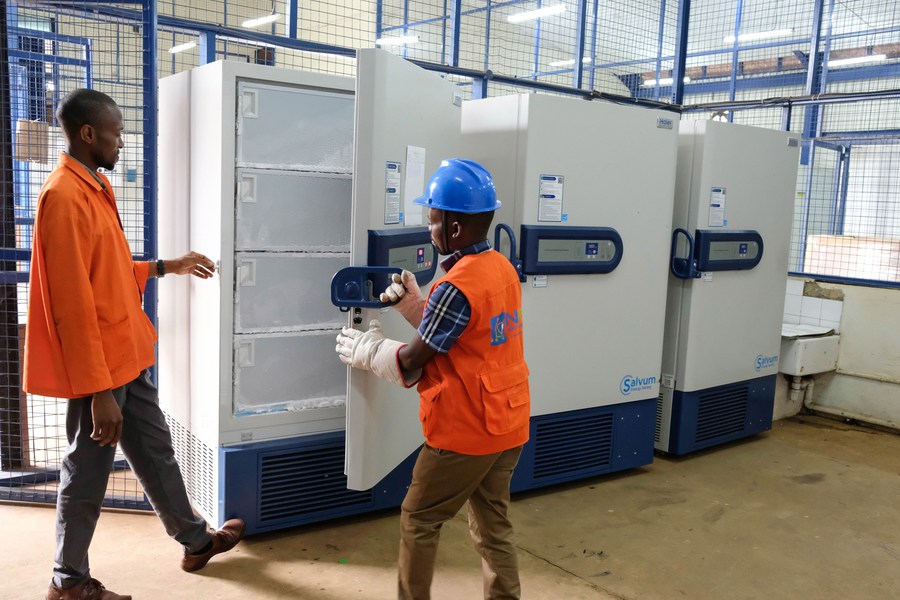 An employee closes an ultra-low temperature freezer containing Ebola trial vaccines at National Medical Stores in Entebbe, Uganda, Dec. 8, 2022. (Photo by Hajarah Nalwadda/Xinhua)