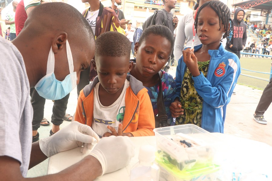 People queue for a free malaria test in Lagos, Nigeria, April 24, 2022. (Photo by Emma Houston/Xinhua)