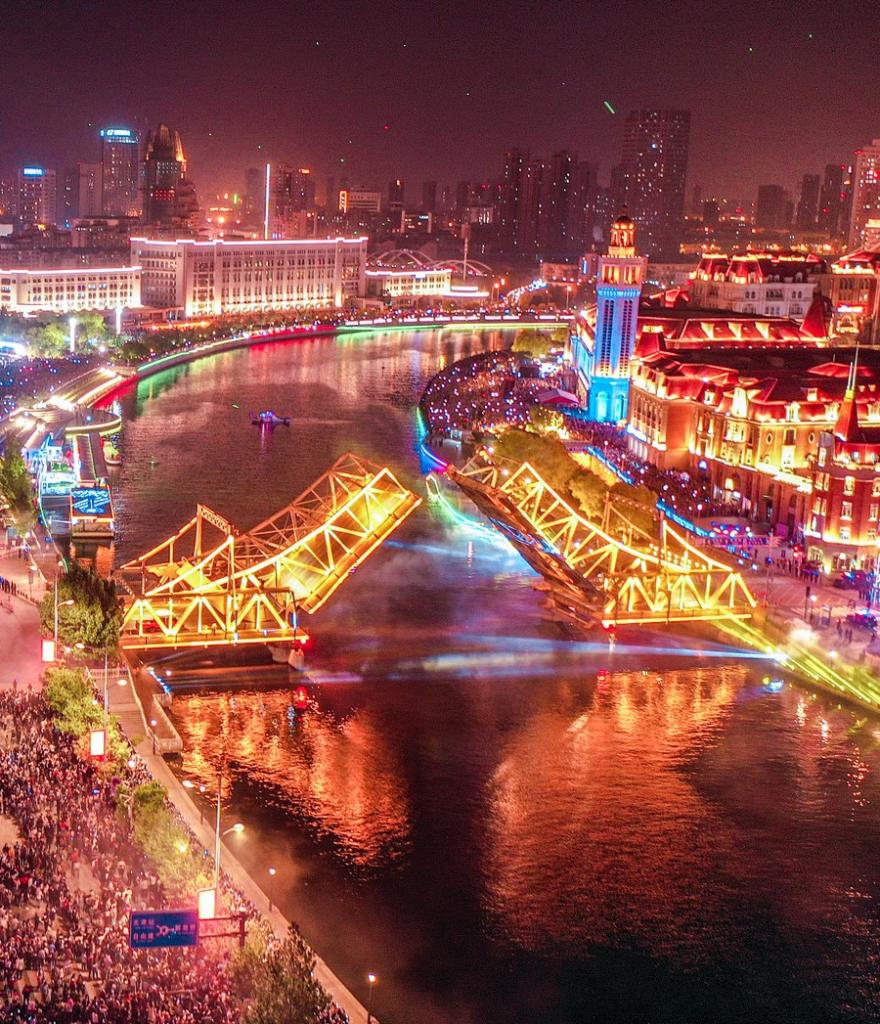 This aerial photo taken on May 1, 2023 shows the opened Jiefang Bridge in Tianjin, north China. The landmark bridge opened on Monday at a maximum angle of 60 degrees. (Xinhua/Sun Fanyue)