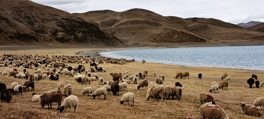 This photo taken with a mobile phone shows herds of sheep grazing by the Yamzbog Yumco Lake, southwest China's Tibet Autonomous Region, May 1, 2023. (Xinhua/Shen Hongbing)