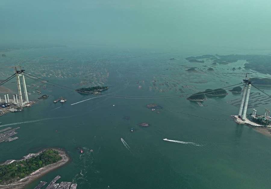 This aerial photo taken on May 1, 2023 shows the Longmen Bridge under construction in Qinzhou City, south China's Guangxi Zhuang Autonomous Region. Located in the city of Qinzhou, the Longmen Bridge, a cross-sea bridge connecting coastal cities along the Beibu Gulf of Guangxi, will stretch roughly 7.6 km, with the main bridge measuring 1,198 meters in length. (Xinhua/Zhou Hua)