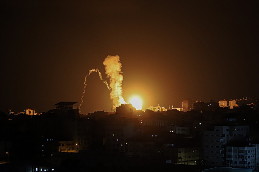 Fire and smoke are seen following an Israeli airstrike in Gaza City, on May 2, 2023. Israel carried out airstrikes on Tuesday night on the posts that belong to Palestinian militant groups led by the Islamic Resistance Movement (Hamas) in the Gaza Strip, Palestinian and Israeli sources said. (Photo by Rizek Abdeljawad/Xinhua)■