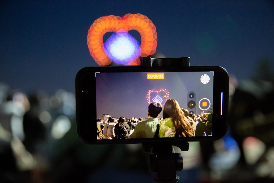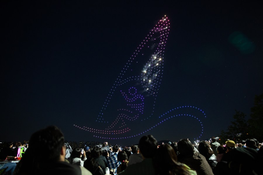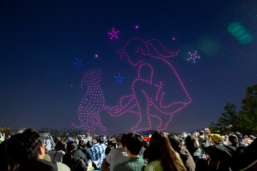 People watch a drone light show at Ttukseom Park in Seoul, South Korea on May 1, 2023. (Xinhua/Wang Yiliang)