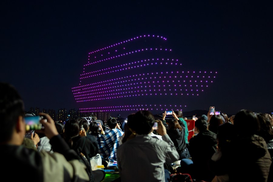 People watch a drone light show at Ttukseom Park in Seoul, South Korea on May 1, 2023. (Xinhua/Wang Yiliang)■