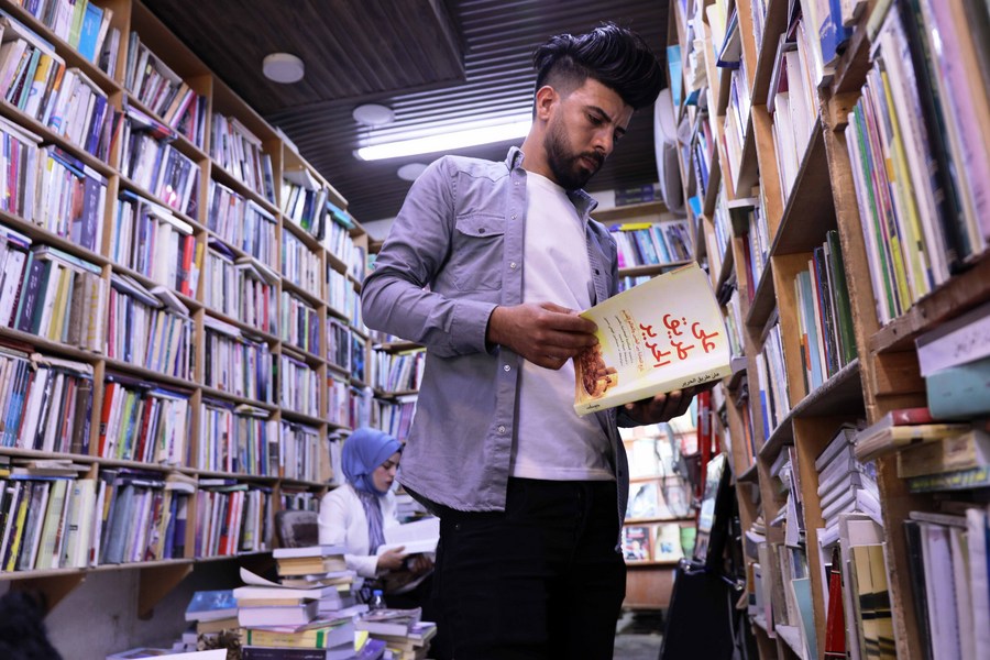 An Iraqi student reads a book on the Belt and Road Initiative, at a bookstore in Baghdad, Iraq, Nov. 21, 2022. (Xinhua/Khalil Dawood)