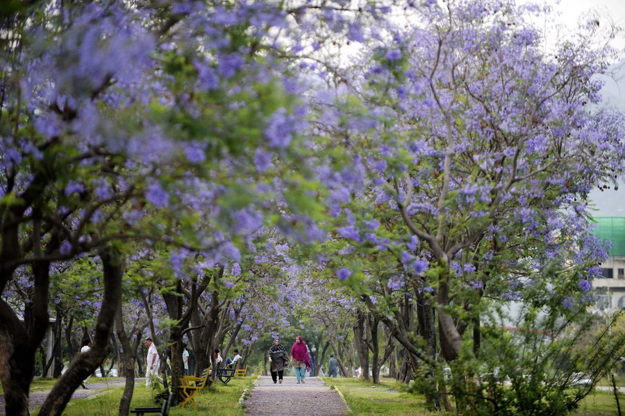 People walk under blooming jacaranda trees in Islamabad, Pakistan on May 2, 2023. (Photo by Ahmad Kamal/Xinhua)