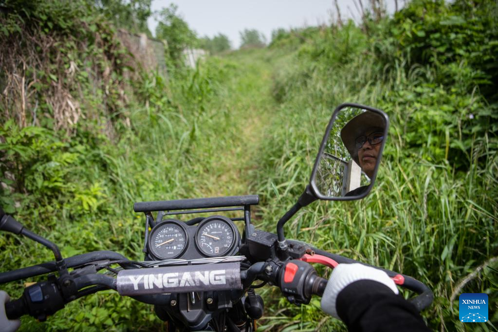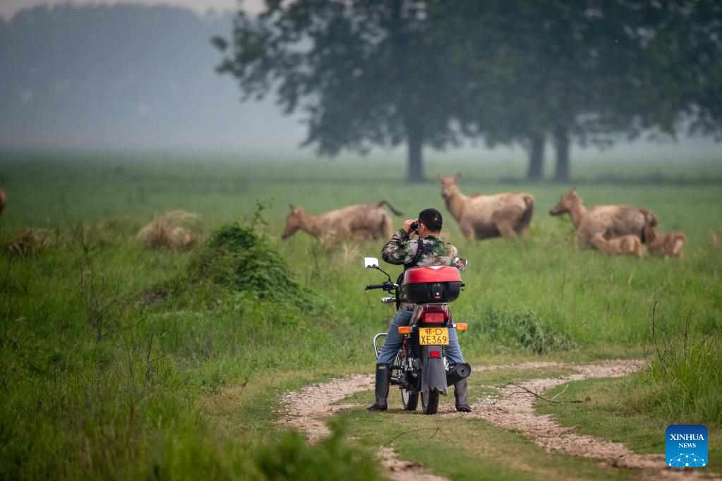 Ranger Wang Chuanjun patrols at Shishou Milu Deer National Nature Reserve in central China's Hubei Province, April 29, 2023.