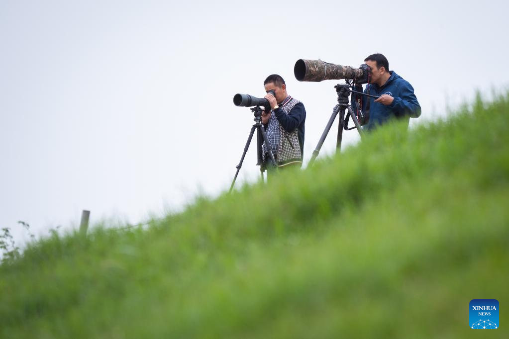 Staff member Zhang Yuming (R) and ranger Liu Jigao observe milu deer at Shishou Milu Deer National Nature Reserve in central China's Hubei Province, April 29, 2023.