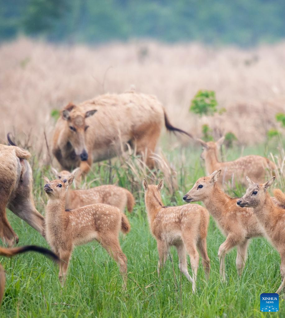 About 150 milu deer fawns have been spotted recently at Shishou Milu Deer National Nature Reserve in Hubei, according to the reserve's management and protection authority.