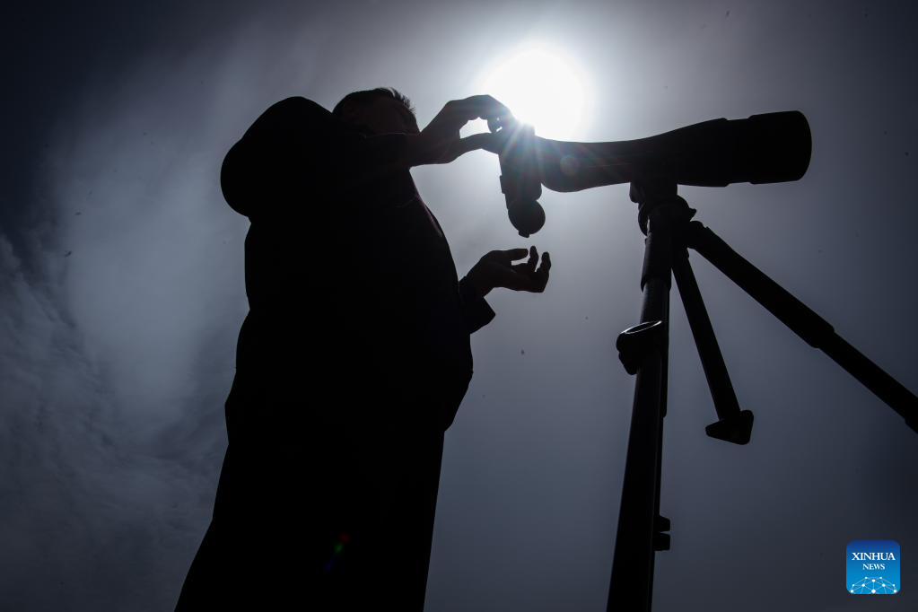 Staff member Zhang Yuming observes milu deer with a telescope at Shishou Milu Deer National Nature Reserve in central China's Hubei Province, April 29, 2023.