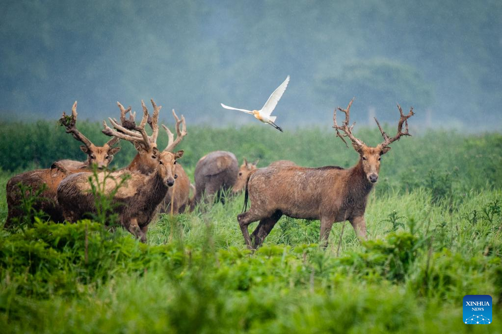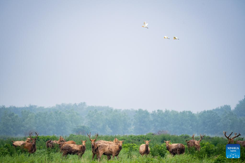 This photo taken on April 28, 2023 shows milu deer and birds at Shishou Milu Deer National Nature Reserve in central China's Hubei Province.