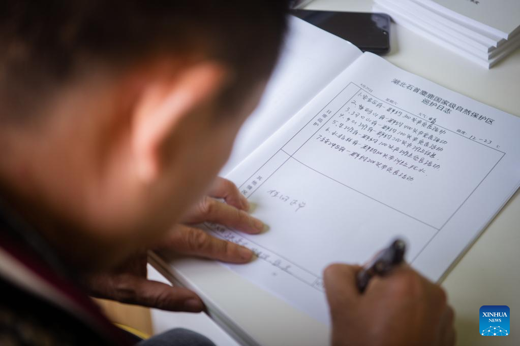 Ranger Liu Jigao fills patrol log at Shishou Milu Deer National Nature Reserve in central China's Hubei Province, April 29, 2023.