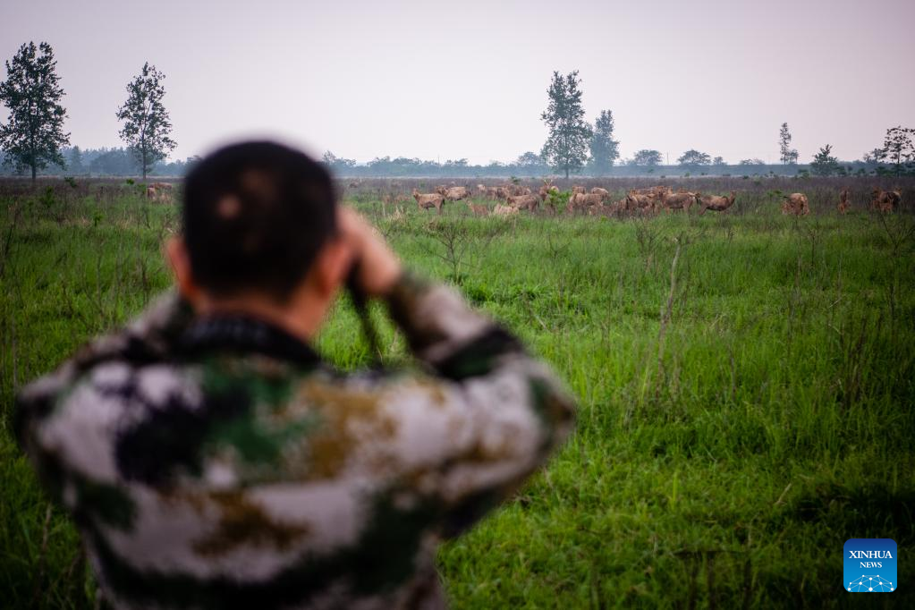 Ranger Liu Jigao observes milu deer at Shishou Milu Deer National Nature Reserve in central China's Hubei Province, April 28, 2023.