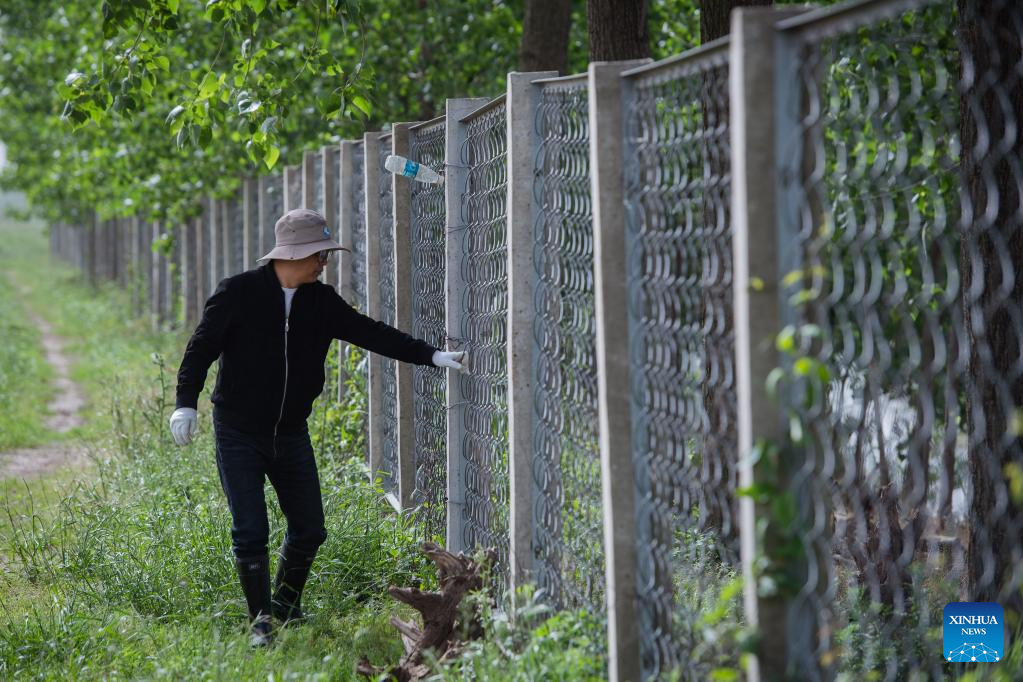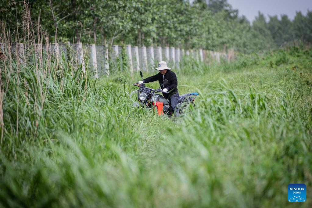 Ranger Wang Chuanjun checks wire netting at Shishou Milu Deer National Nature Reserve in central China's Hubei Province, April 29, 2023.