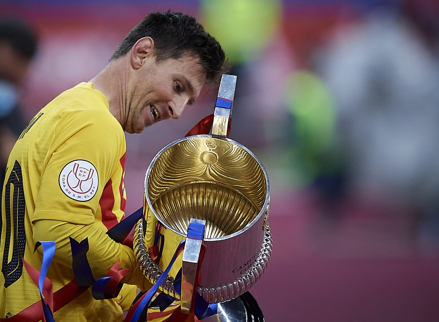Lionel Messi of FC Barcelona looks at the trophy after beating Athletic Bilbao in the 2020-21 season Spanish King's Cup final in Seville, Spain, on April 17, 2021. (Photo by Pablo Morano/Xinhua)