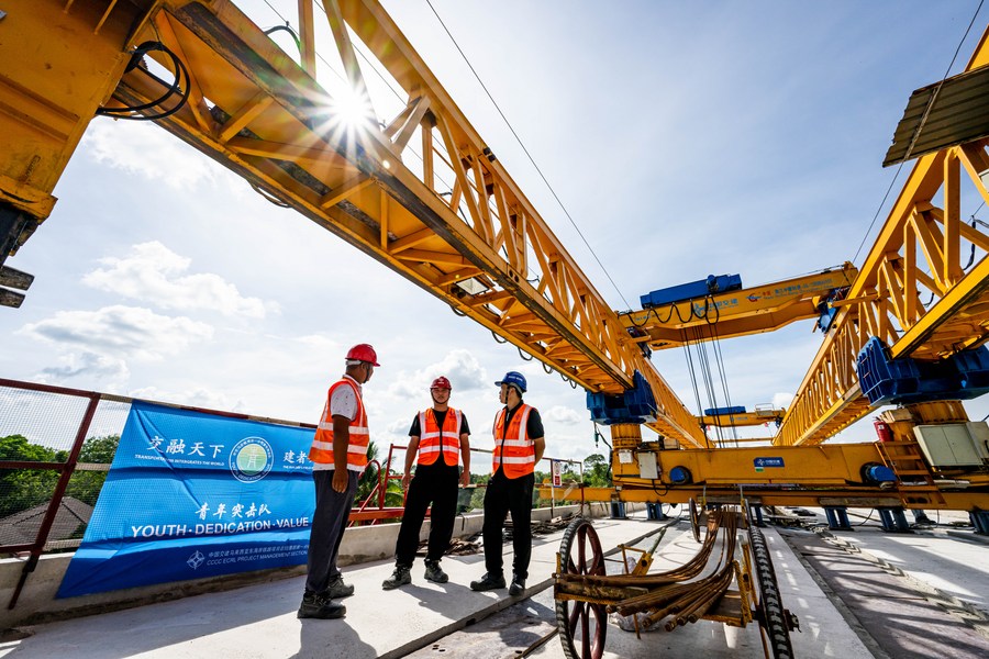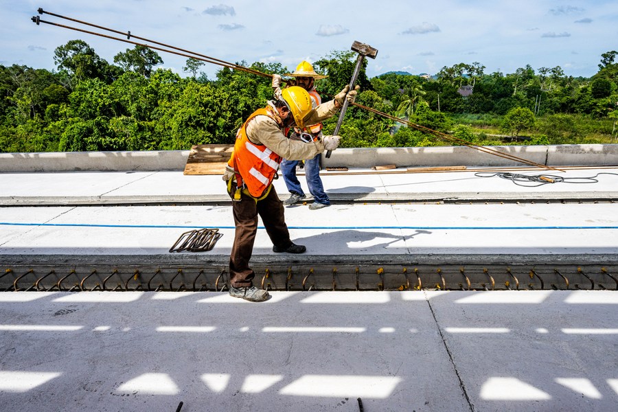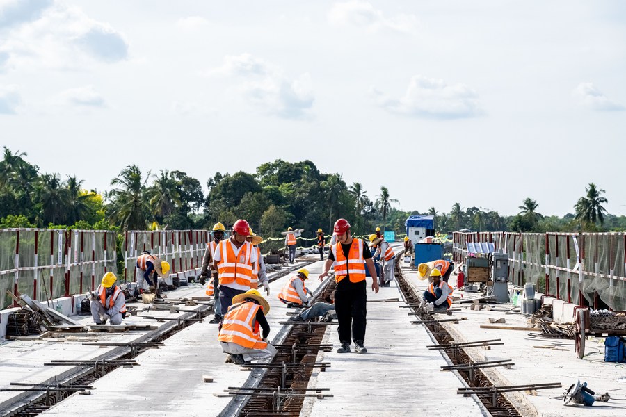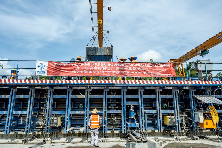 People work at a construction site of the East Coast Rail Link (ECRL), a major infrastructure project under the Belt and Road Initiative (BRI) in Kelantan, Malaysia, April 26, 2023. (Xinhua/Zhu Wei)
