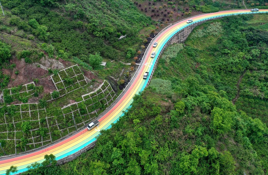 Vehicles run on a musical road painted with colors in Xuan'en County, central China's Hubei Province, May 4, 2023. (Photo by Chen Xukai/Xinhua)