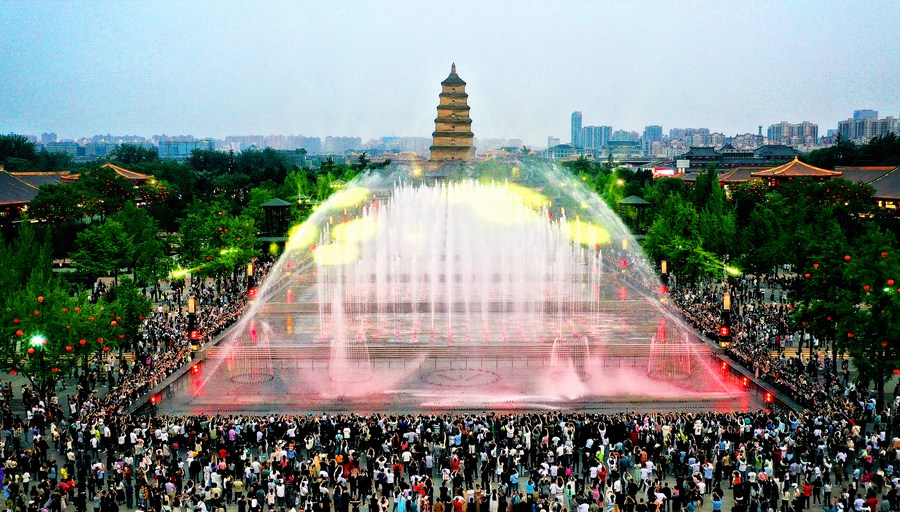 This aerial photo taken on April 18, 2023 shows a music fountain show at the north square of the Giant Wild Goose Pagoda in Xi'an, northwest China's Shaanxi Province. Xi'an, a city with over 3,100 years of history, served as the capital for 13 dynasties in Chinese history. It is also home to the world-renowned Terracotta Warriors created in the Qin Dynasty (221-207 BC). (Xinhua/Liu Xiao)