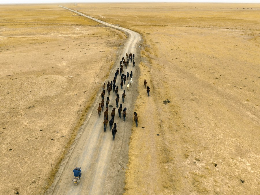 This aerial photo taken on May 3, 2023 shows herdsman driving horses on the way to summer pastures in Kazak Autonomous County of Aksay, northwest China's Gansu Province. (Photo by Gao Hongshan/Xinhua)
