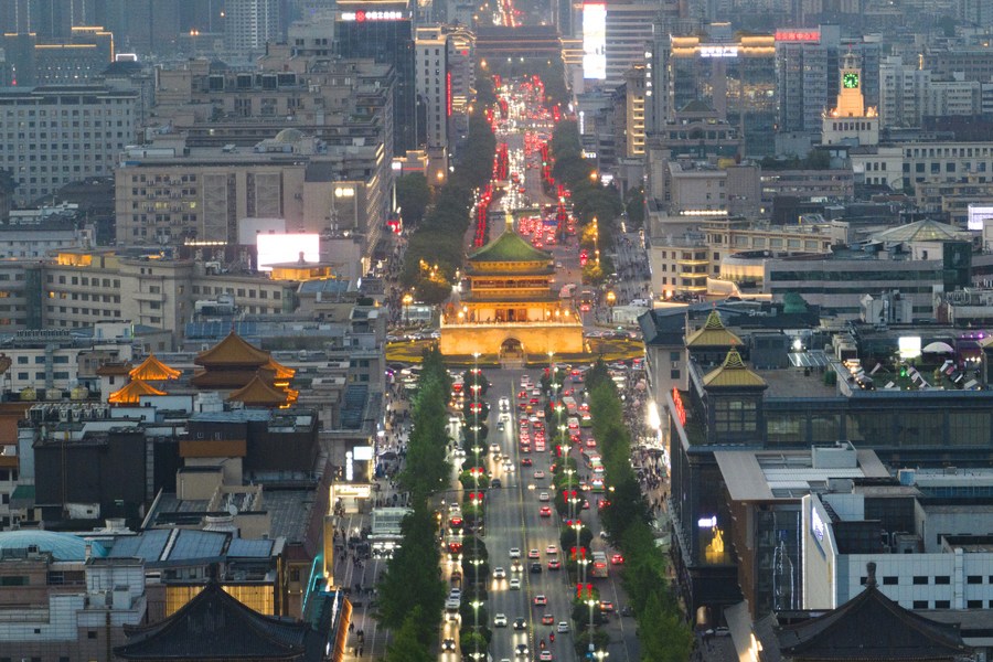 This aerial photo taken on April 25, 2023 shows a view of the Bell Tower in Xi'an, northwest China's Shaanxi Province.