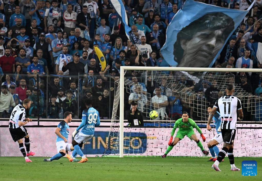 Udinese's Sandi Lovric (1st L) scores his goal during the Serie A football match between Napoli and Udinese in Udine, Italy, on May 4, 2023. (Photo by Alberto Lingria/Xinhua)