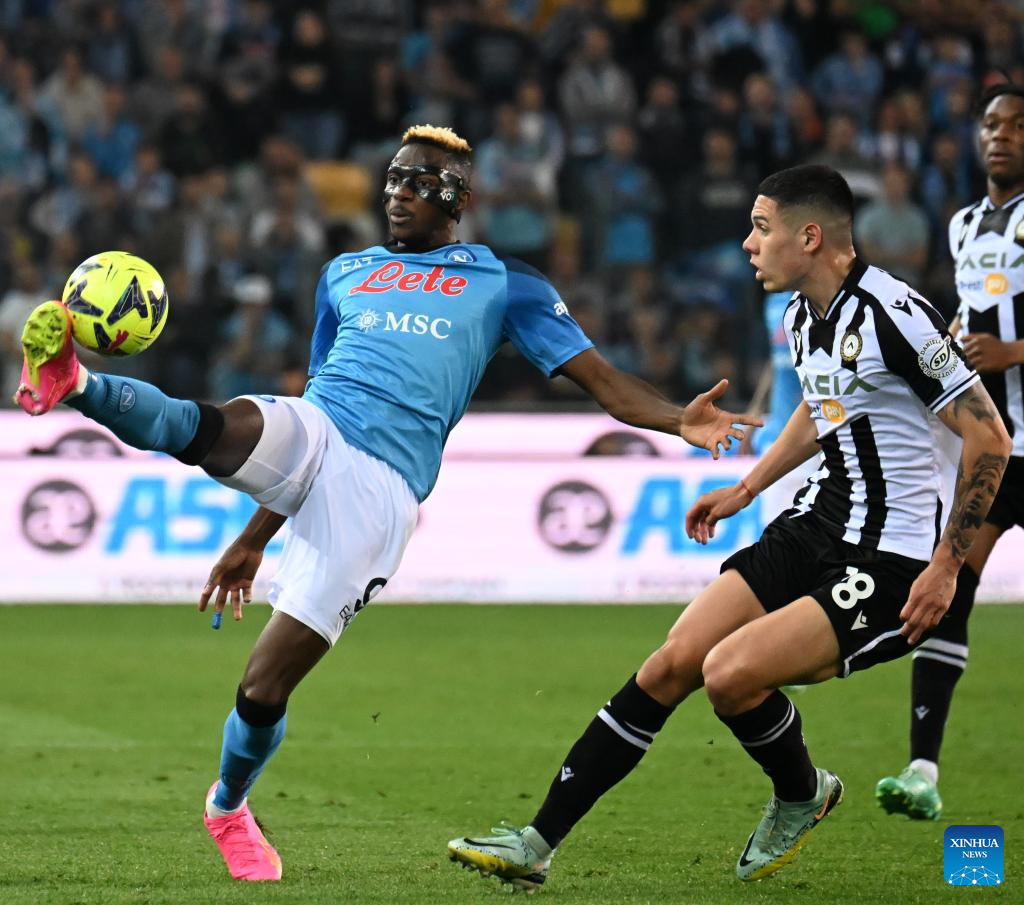 Udinese's Nehuen Perez (R) vies with Napoli's Victor Osimhen during the Serie A football match between Napoli and Udinese in Udine, Italy, on May 4, 2023. (Photo by Alberto Lingria/Xinhua)