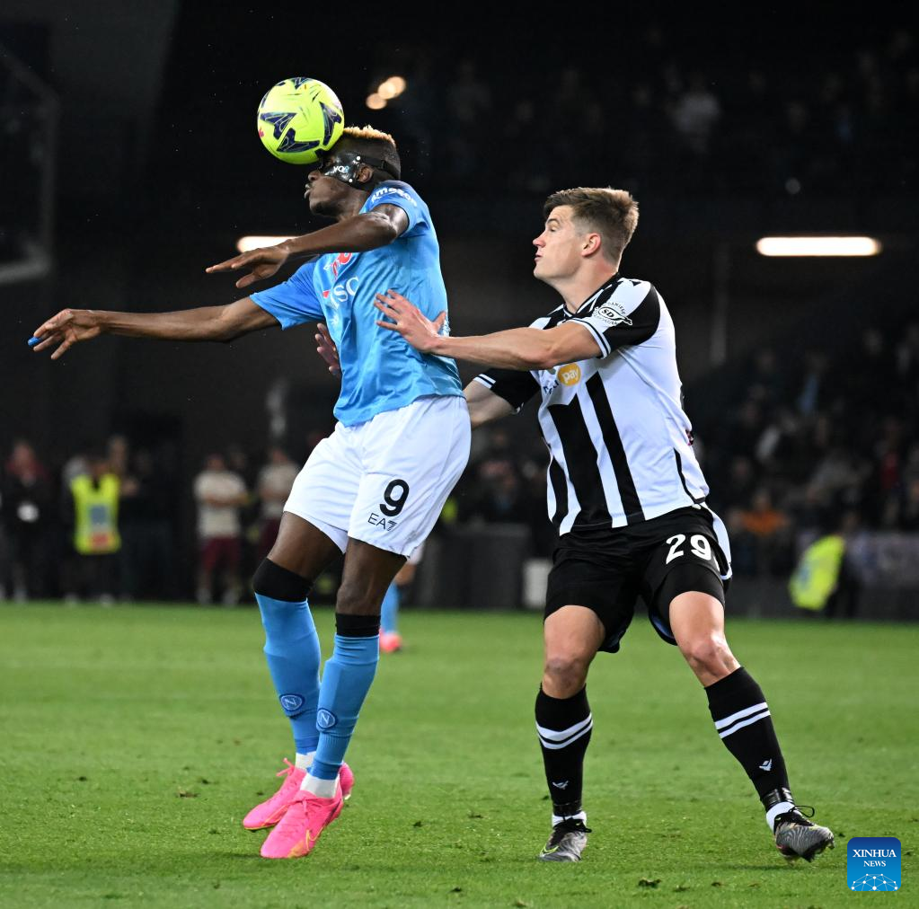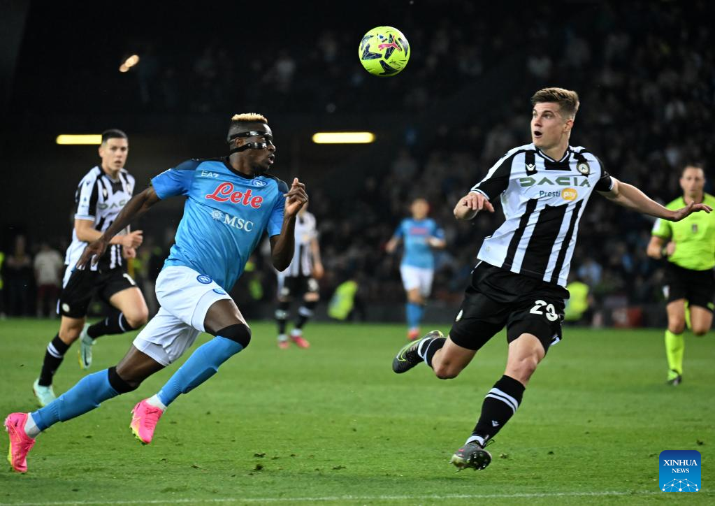 Udinese's Jaka Bijol (R) vies with Napoli's Victor Osimhen during the Serie A football match between Napoli and Udinese in Udine, Italy, on May 4, 2023. (Photo by Alberto Lingria/Xinhua)