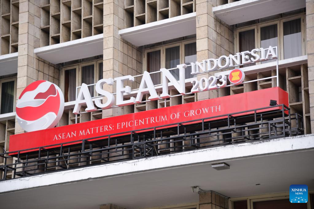 This photo taken on May 5, 2023 shows logos of the 2023 ASEAN Summit on the building of Bank Indonesia in Jakarta, Indonesia. Preparations are now ready to secure and facilitate the 42nd summit of the Association of Southeast Asian Nations (ASEAN), which will be convened in the Indonesian resort spot of Labuan Bajo next week. Indonesia, the largest economy in the region, is chairing ASEAN this year with the theme of "ASEAN Matters: Epicentrum of Growth." (Xinhua/Xu Qin)