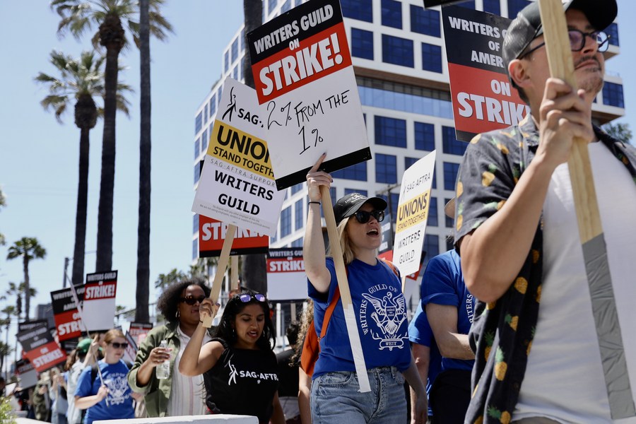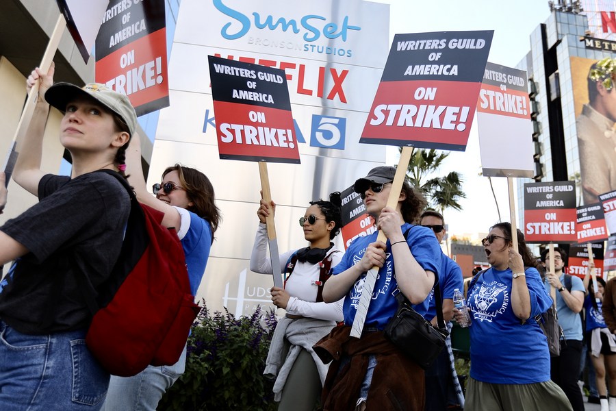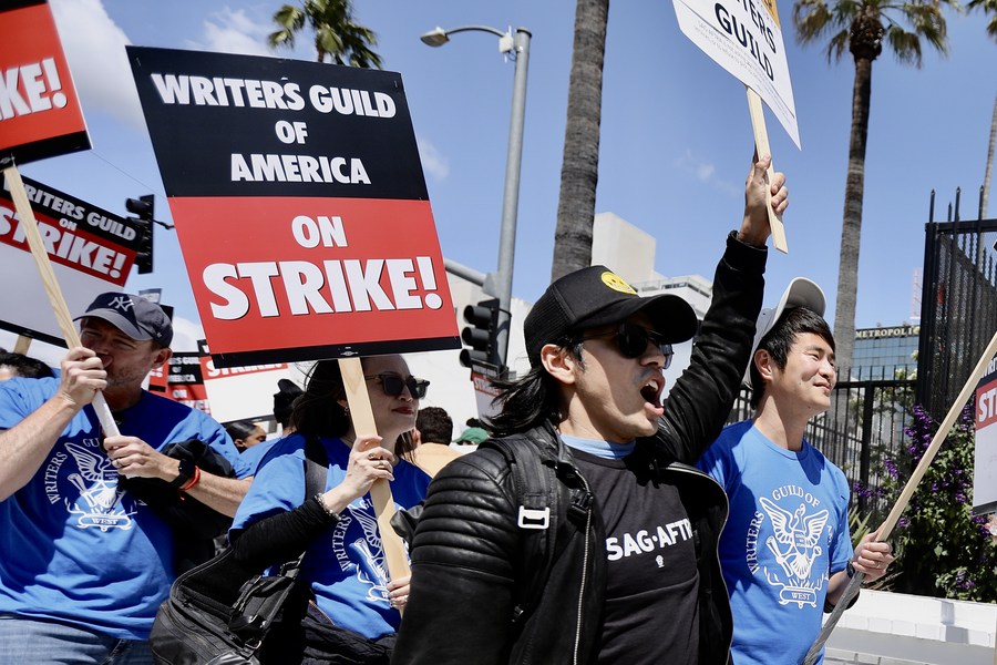 Entertainment industry writers demonstrate in Hollywood, Los Angeles, the United States, on May 2, 2023. (Xinhua)
