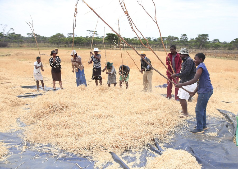 People deal with harvested wheat at a farm in Chegutu, west of the capital Harare, Zimbabwe, Oct. 31, 2022. (Photo by Shaun Jusa/Xinhua)