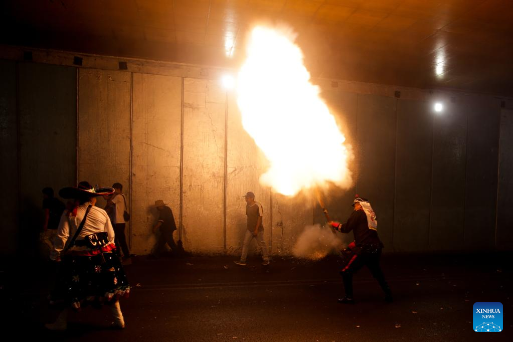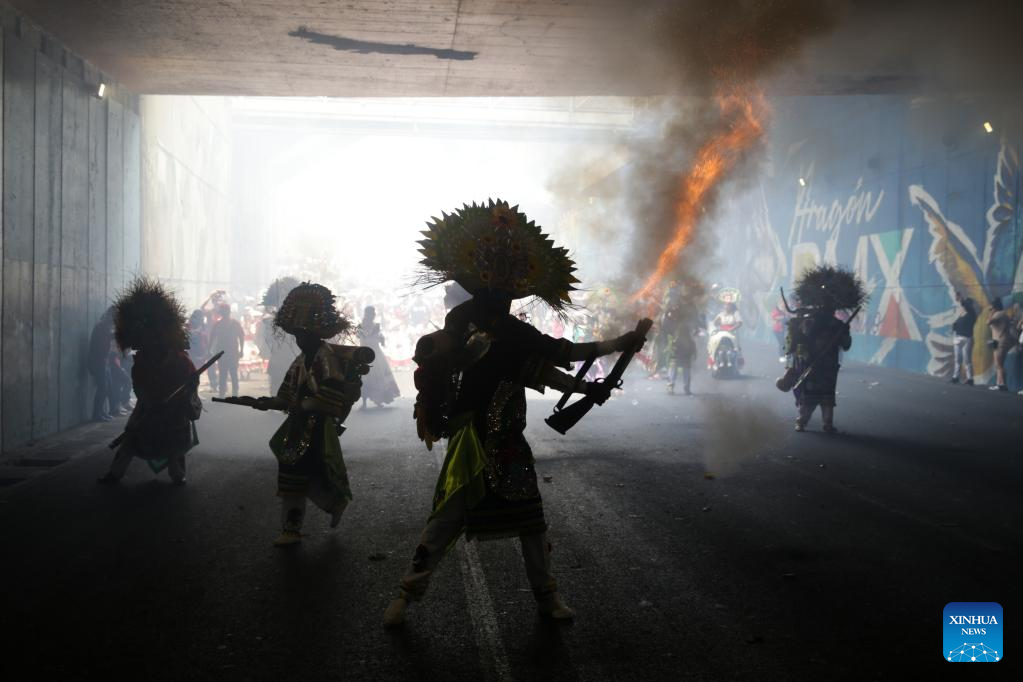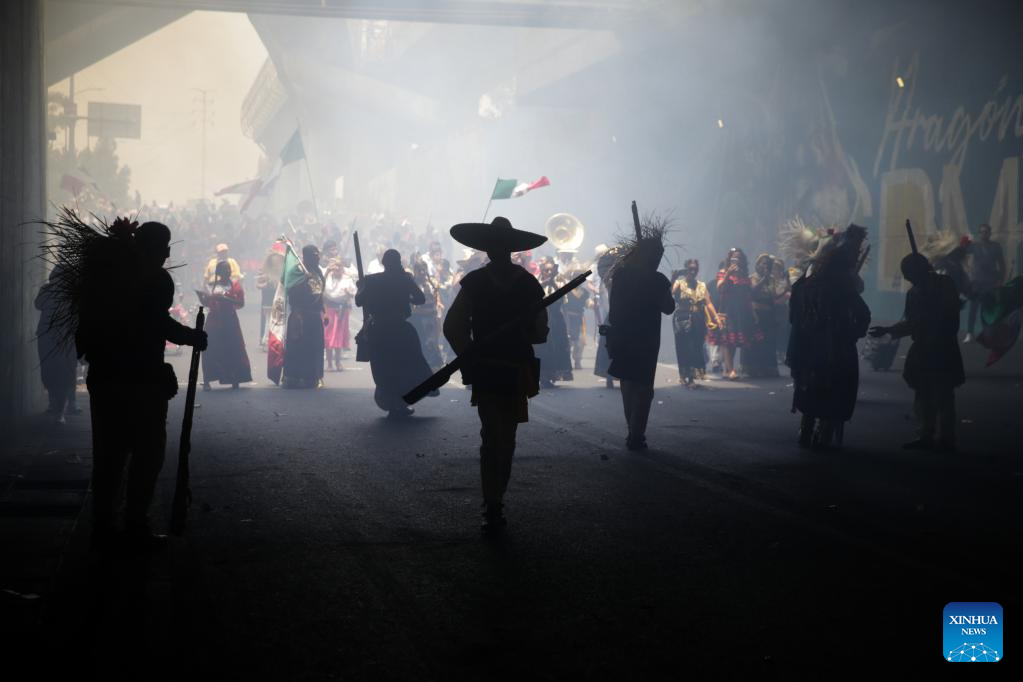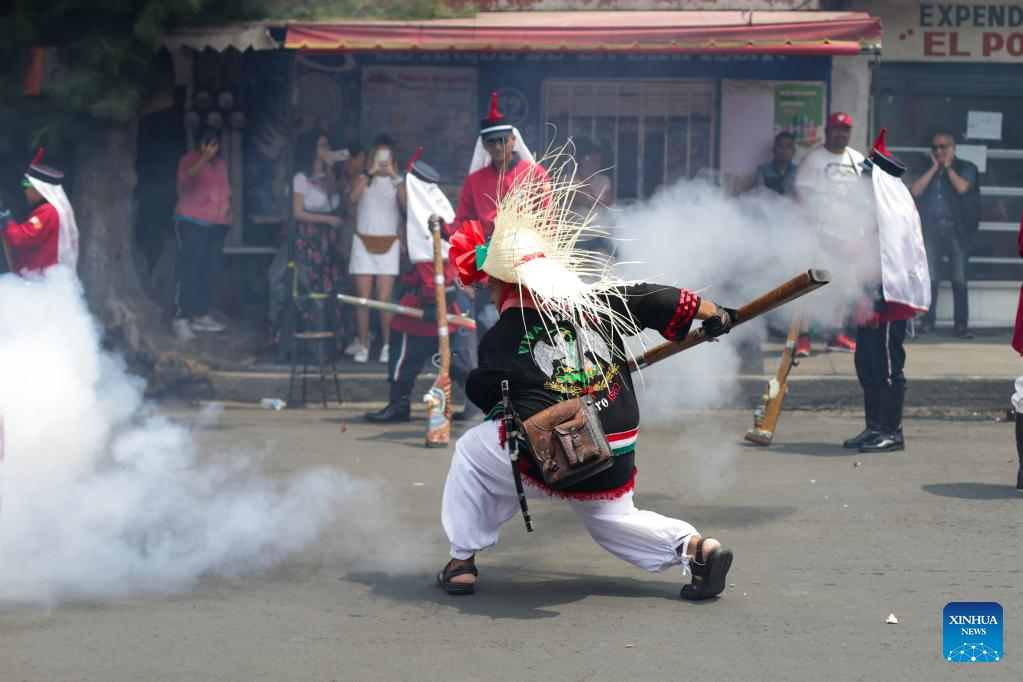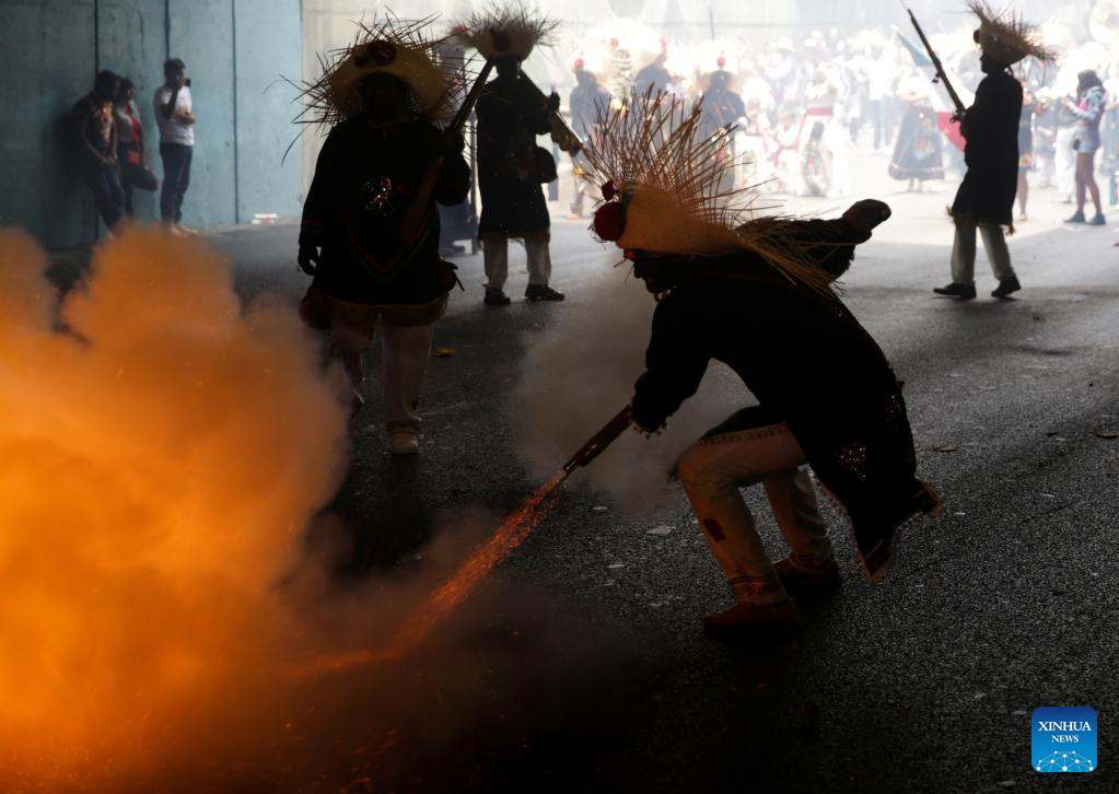 People take part in a performance in celebration of the 161st anniversary of the Battle of Puebla in Mexico City, Mexico, on May 5, 2023. A traditional re-enactment of the Battle of Puebla on May 5, 1862, between French troops and Mexican forces, took place here on Friday. (Xinhua/Francisco Canedo)