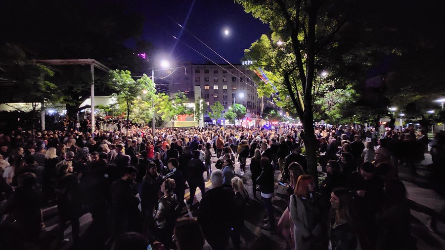 People gather near the site of a school shooting in Belgrade, Serbia, on May 3, 2023. (Photo by Nemanja Cabric/Xinhua)