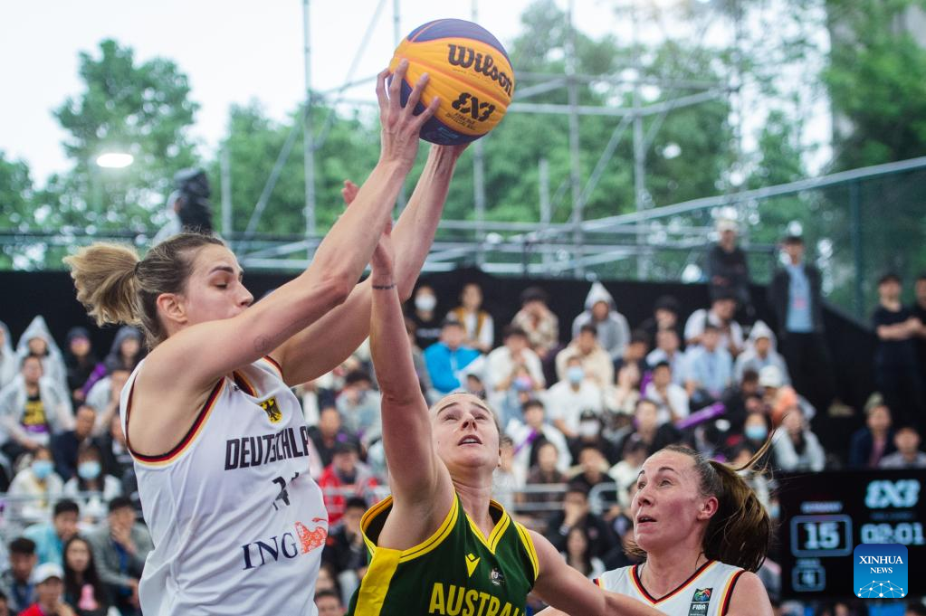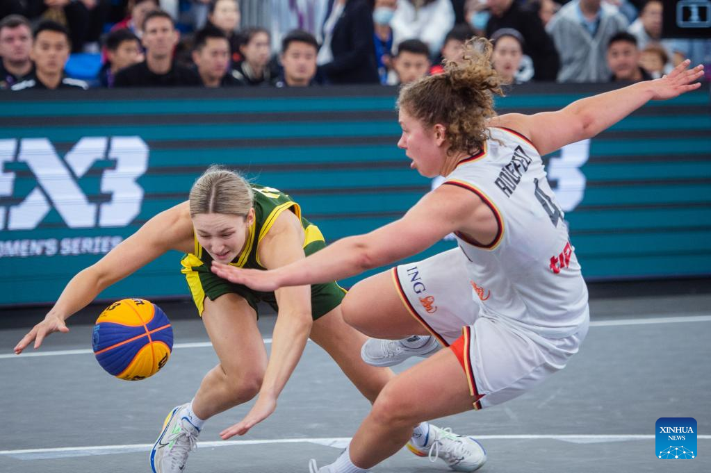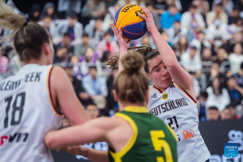 Svenja Brunckhorst (R) of Germany catches a pass during a 2023 FIBA 3x3 Women's Series Wuhan Stop match against Australia in Wuhan, central China's Hubei Province on May 6, 2023. (Xinhua/Wu Zhizun)