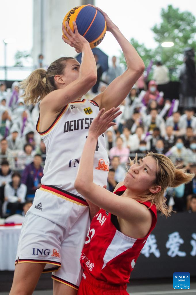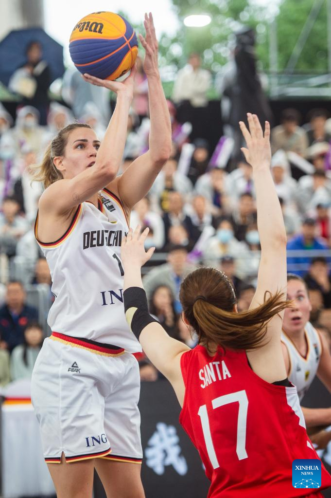 Sonja Greinacher (L) of Germany shoots during a 2023 FIBA 3x3 Women's Series Wuhan Stop match against Japan in Wuhan, central China's Hubei Province on May 6, 2023. (Xinhua/Wu Zhizun)
