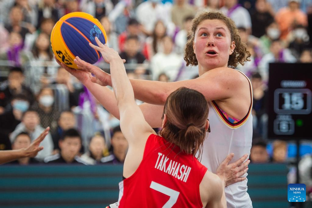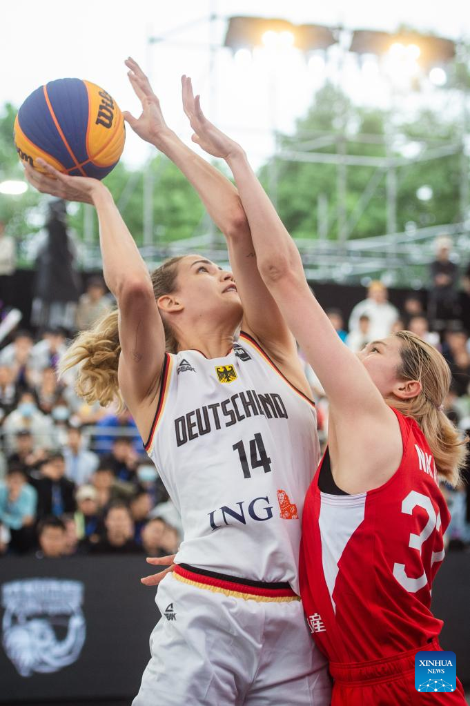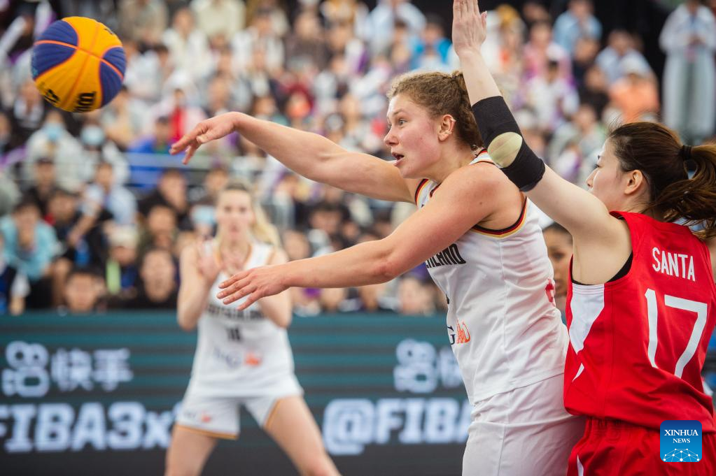 Sonja Greinacher (L) of Germany competes during a 2023 FIBA 3x3 Women's Series Wuhan Stop match against Japan in Wuhan, central China's Hubei Province on May 6, 2023. (Xinhua/Wu Zhizun)