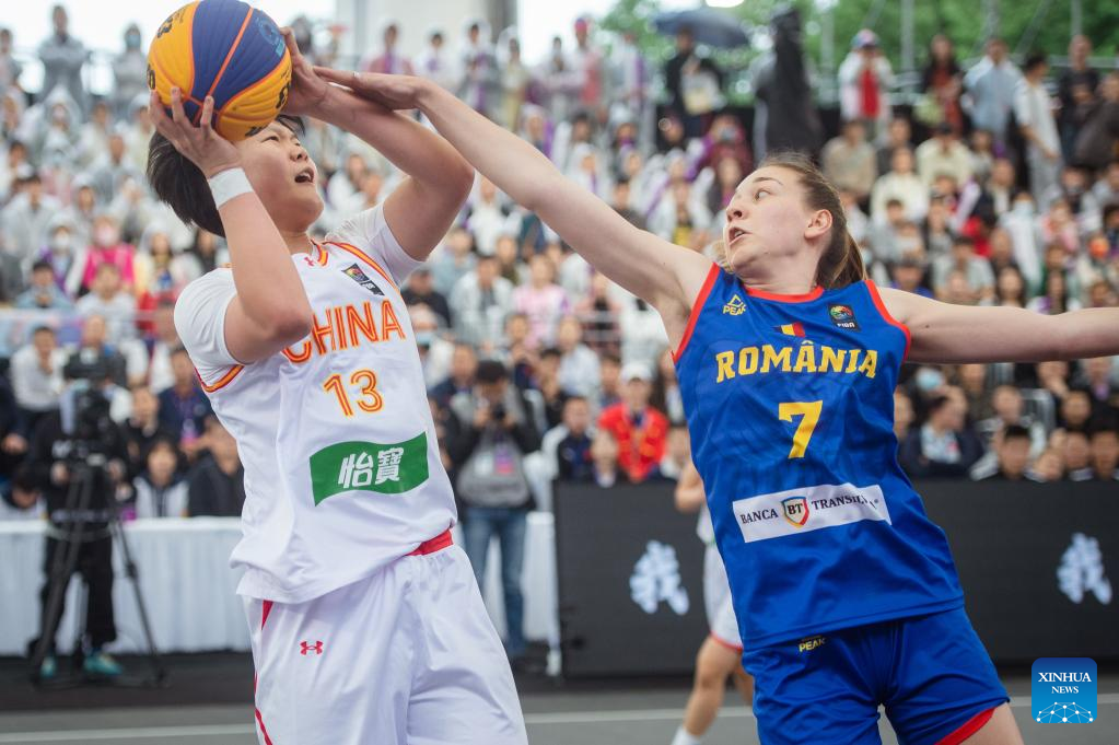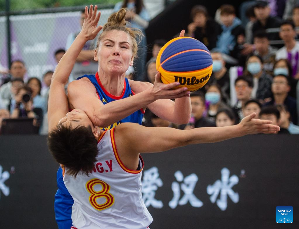 Teodora Manea (R) of Romania defends Wan Jiyuan of China during their 2023 FIBA 3x3 Women's Series Wuhan Stop match in Wuhan, central China's Hubei Province on May 6, 2023. (Xinhua/Wu Zhizun)