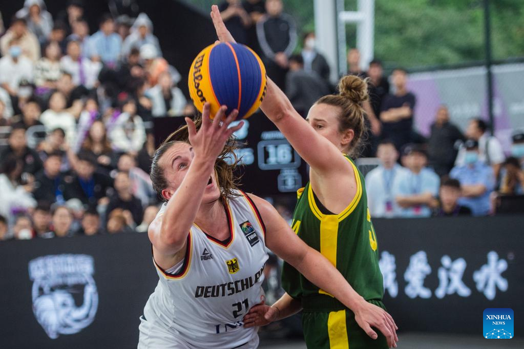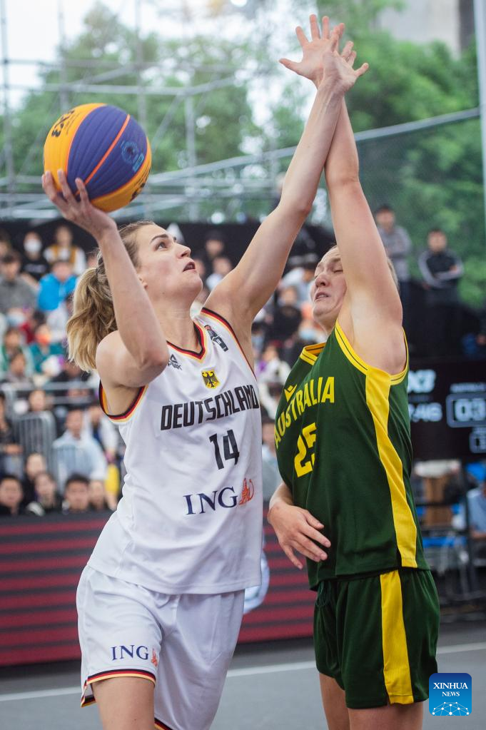 Sonja Greinacher (L) of Germany shoots during a 2023 FIBA 3x3 Women's Series Wuhan Stop match against Australia in Wuhan, central China's Hubei Province on May 6, 2023. (Xinhua/Wu Zhizun)