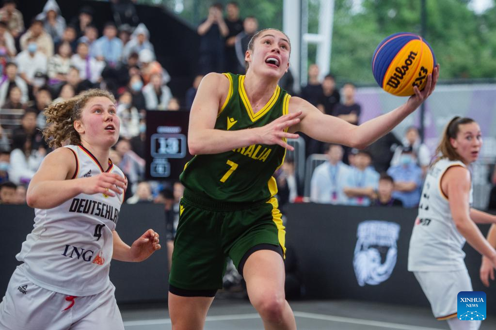 Emma Renee Clarke (2nd L) of Australia goes for a lay-up during a 2023 FIBA 3x3 Women's Series Wuhan Stop match against Germany in Wuhan, central China's Hubei Province on May 6, 2023. (Xinhua/Wu Zhizun)