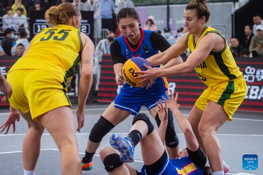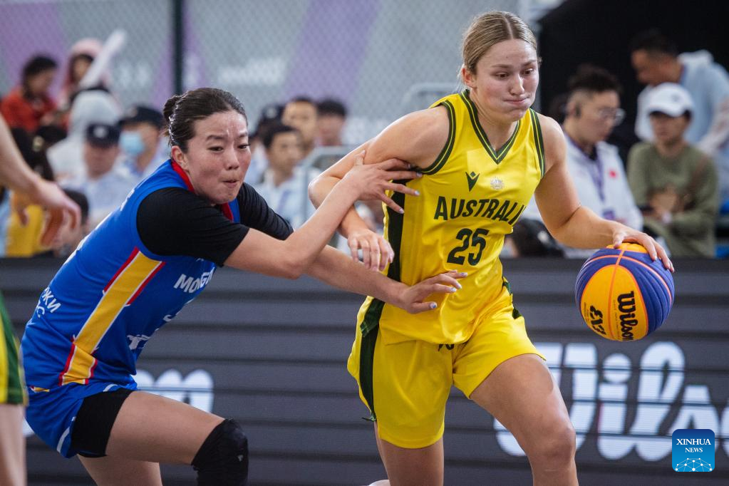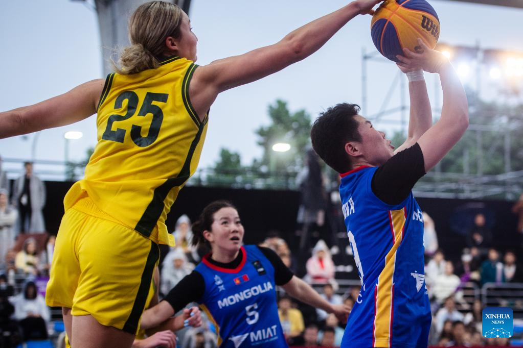 Lauren Mansfield (1st R) of Australia competes against Khulan Onolbaatar of Mongolia during their 2023 FIBA 3x3 Women's Series Wuhan Stop match in Wuhan, central China's Hubei Province on May 6, 2023. (Xinhua/Wu Zhizun)