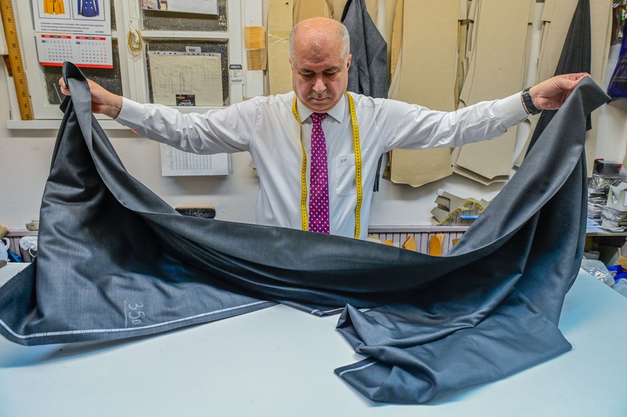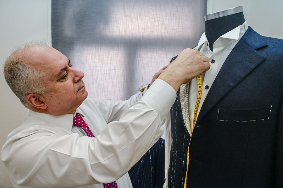 A photo taken on April 24 shows Mehmet Yilmaz, a tailor in Türkiye's largest city Istanbul, prepares a suit for his customer. (Photo by Omer Kuscu/Xinhua)