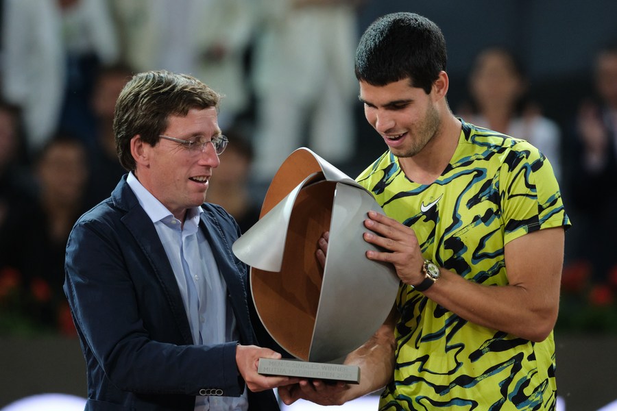 Carlos Alcaraz (R) of Spain receives the trophy from the Mayor of Madrid, Jose Luis Martinez-Almeida during the awarding ceremony for the men's singles final of the Madrid Open tennis tournament in Madrid, Spain, May 7, 2023. (Xinhua/Meng Dingbo)