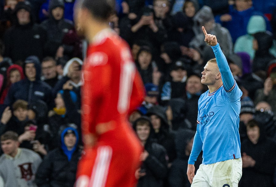 Manchester City's Erling Haaland celebrates after scoring a goal during the UEFA Champions League quarterfinal first leg against Bayern Munich in Manchester, Britain on April 11, 2023. (Xinhua)