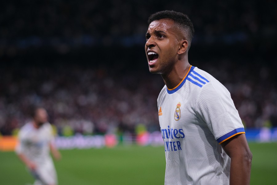 Real Madrid's Rodrygo celebrates his goal during the UEFA Champions League semifinal second leg against Manchester City in Madrid, Spain on May 4, 2022. (Xinhua/Meng Dingbo)